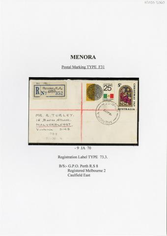 Also attached: Olympic Games Mexico 1968 25c; Christmas 1969 Stained Glass 5c postage stamp(s); Black ink postmark from Menora (F31 type).