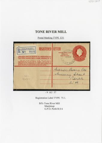 Registration Label, Tone River Mill (with E31 type postmark), 1957