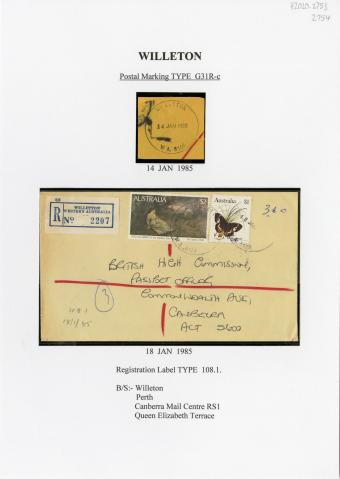 Postmark from Willetton, black ink, circular, (G31R-c type), dated 14 January 1985.