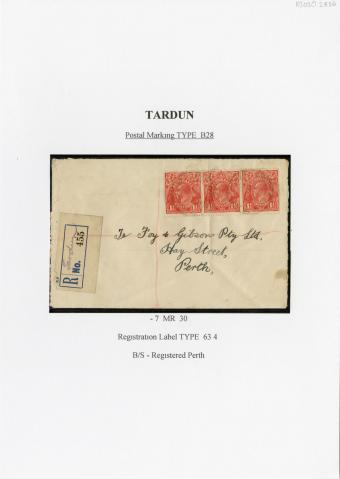 Also attached: King George V 1½d Red postage stamp(s); Black ink postmark from Tardun (B28 type).