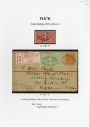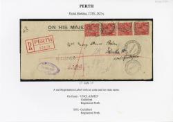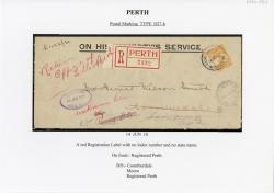Also attached: King George V 4d Orange (OS Perfin) postage stamp(s); Black ink postmark from Registered Perth (D27-c type).