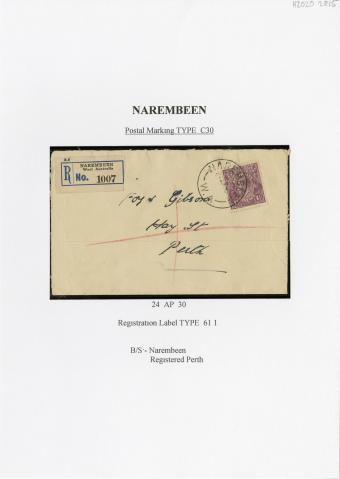 Registration Label, Narembeen (with C30 type postmark), 1930
