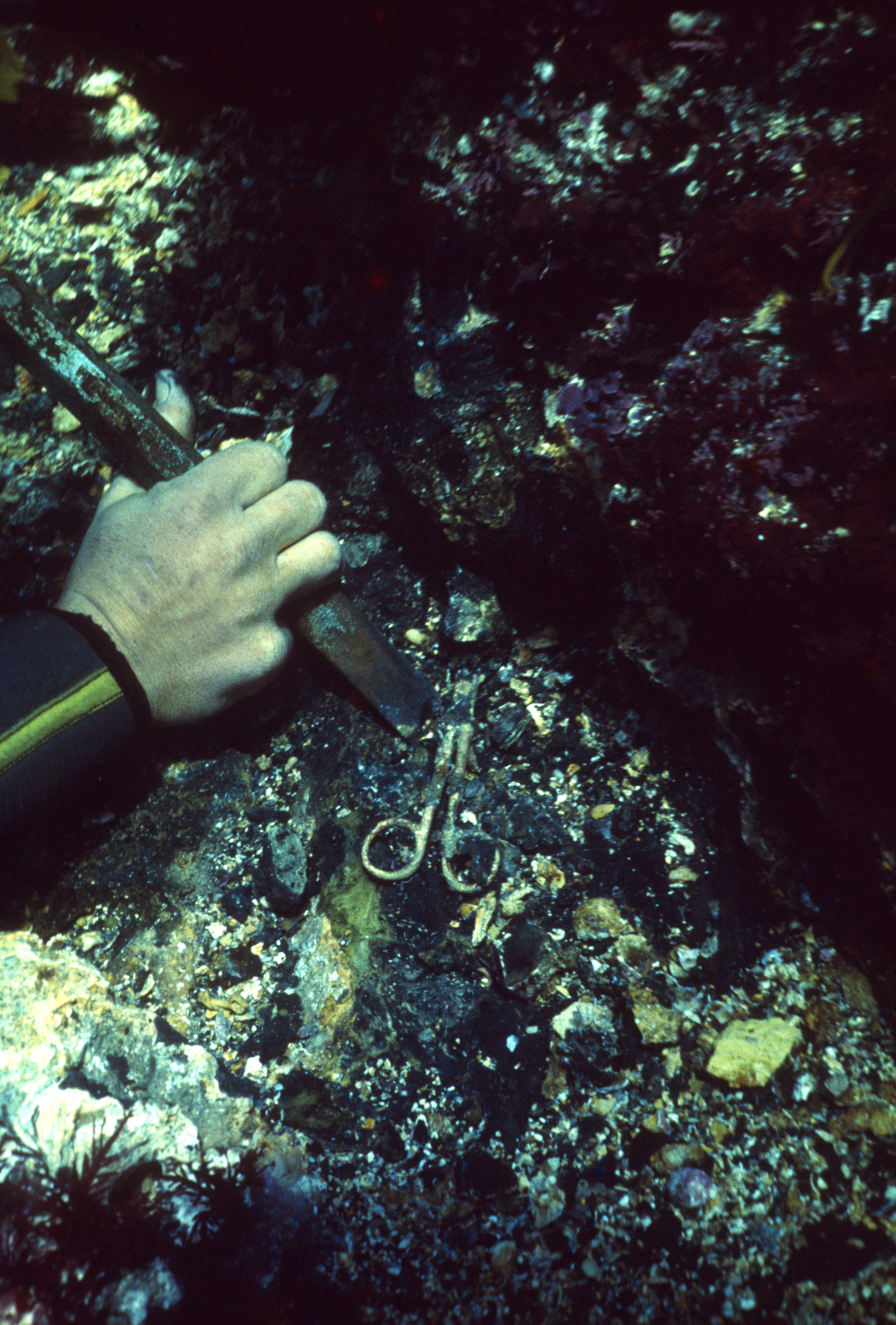 This single pair of candle snuffers, snuiter or snuiterschaar in Dutch, are the only in-tact pair to have been retrieved across the four Western Australian VOC shipwrecks. These were carefully extracted from concretion under cannon 12 (GT1454) on site in March 1972 by Graeme Henderson as part of the Vergulde Draeck expeditions by the Western Australian Museum in 1971-1972.
