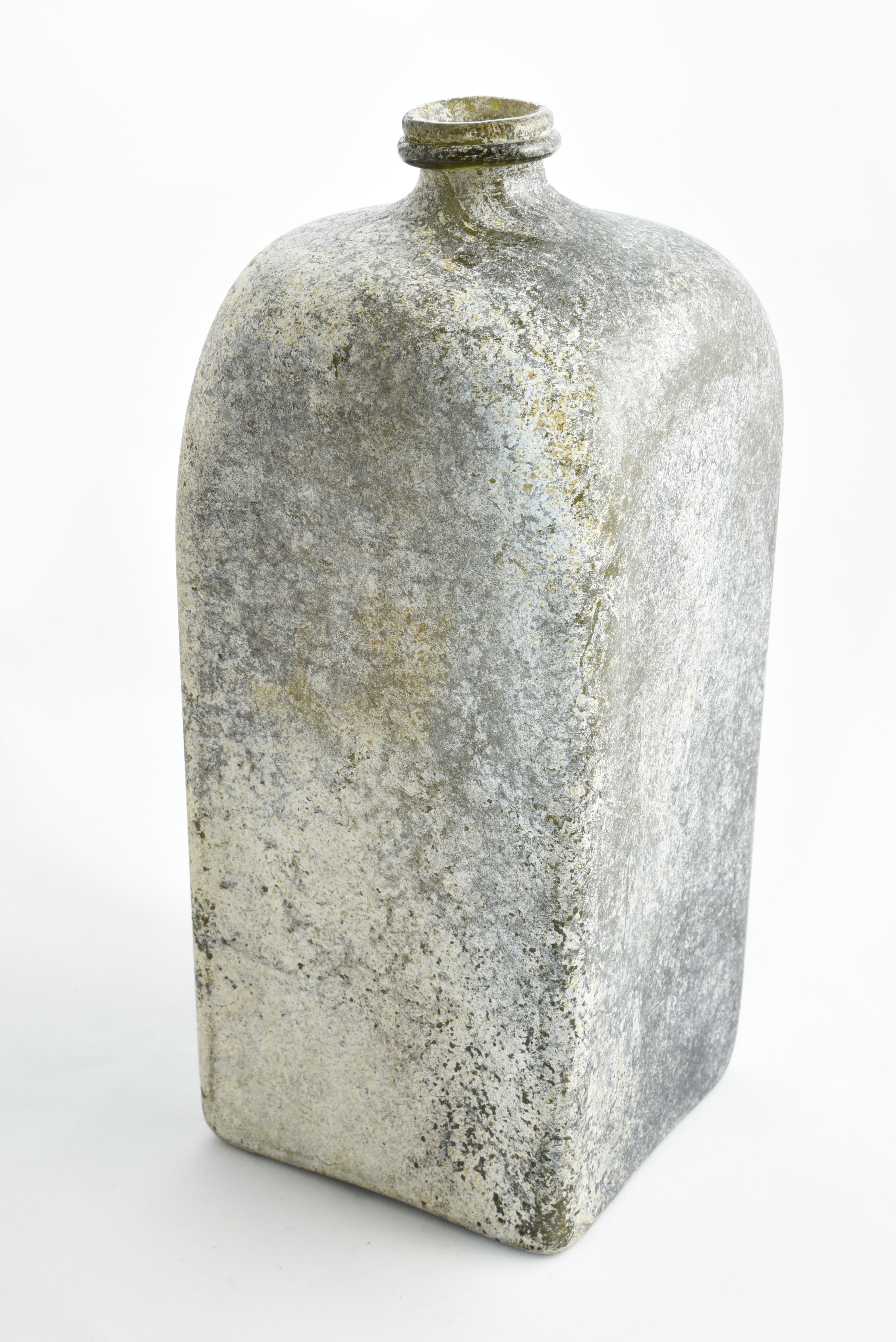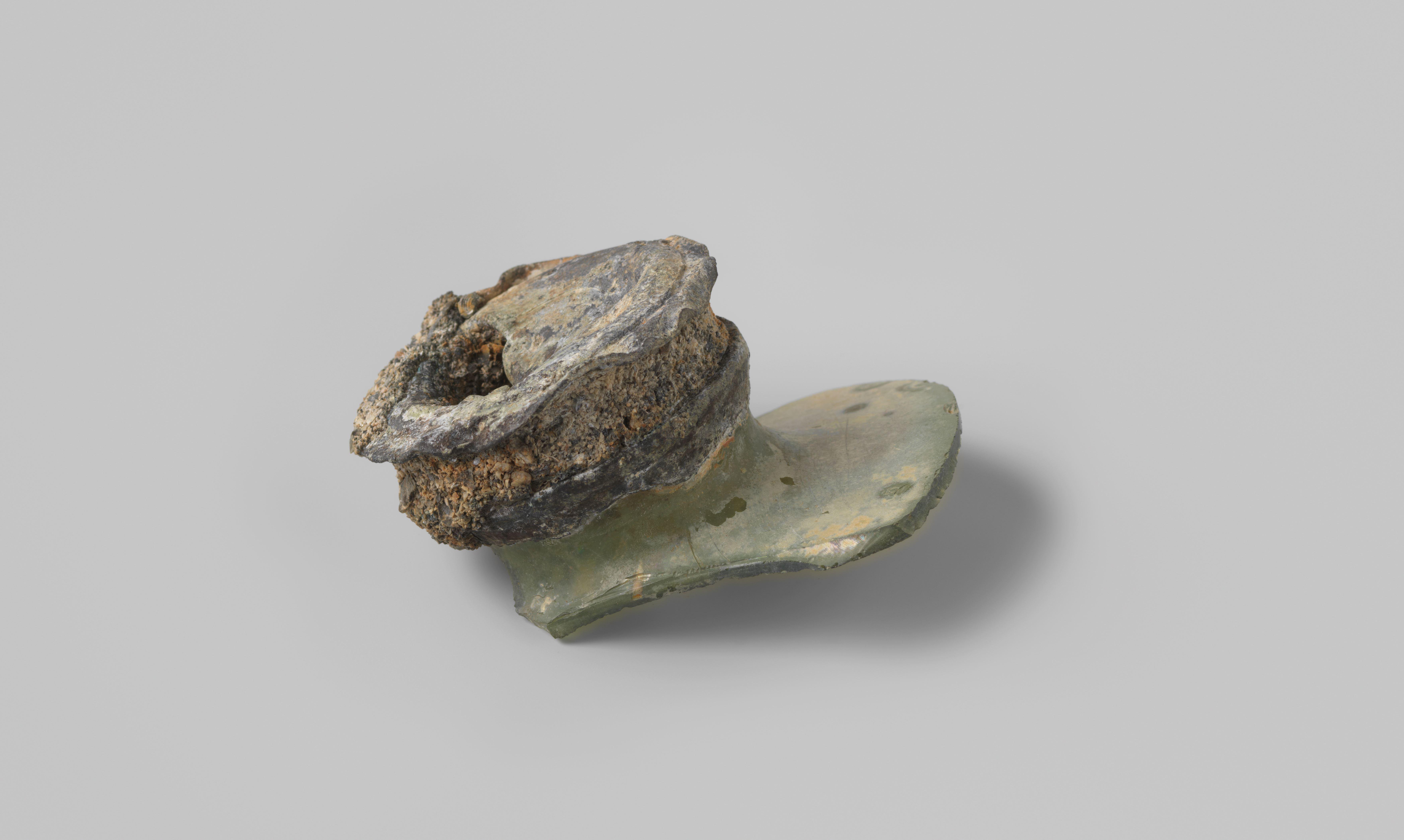 This type of bottle is more commonly known as a ‘case bottle’ or, in Dutch, kelderfles. This name derives from the fact these bottles were designed to be transported and stored in cases. The glass was blown into a standard squared mould to achieve the shape and size required. From its measurements, we can tell this bottle could have held approximately half a gallon of liquid (c. 2.25 litres). The slight concavity of the sides of the large bottles is caused by the glass sagging under its own weight as it cooled. The bottle would have once been sealed with a tin or pewter cap: note this example from a similarly dated wreck held in the Rijksmuseum.