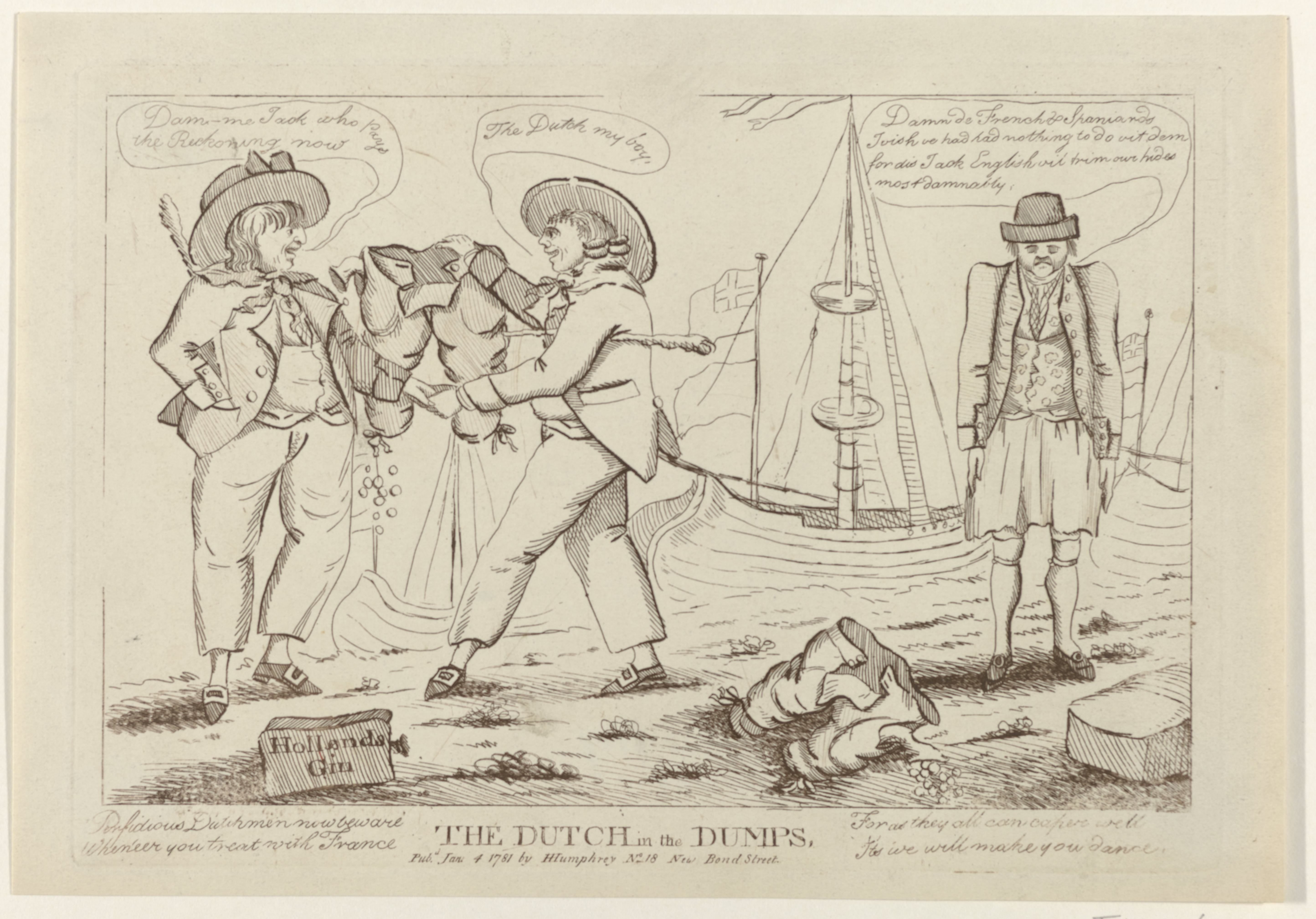 On ships, this style of case bottle is commonly associated with gin: they were bestowed the name ‘Dutch gin bottle’ due to their use to store and transport large quantities of gin onboard Dutch ships. This was because gin, or jenever, was believed to have medicinal properties and a ration was given to mariners to maintain good health (McNulty 1971). This development only seems to have come about over the course of the 18th century, with brandy previously the more commonly issued strong spirit on Dutch vessels (Jarvis 2023). Therefore, while gin was one of the many forms of liquor Dutch mariners were famous for generously imbibing (note this English cartoon from the late 18th century), it should not be assumed that large quantities of gin would have been on board Zeewijk which wrecked in 1727. Moreover, the journals that we have from the wrecking of Zeewijk refer to the sharing out of wine, brandy, and even rum, but not gin. It is, therefore, likely that the bottles did transport a form of alcohol but the association with gin in this instance is not likely.